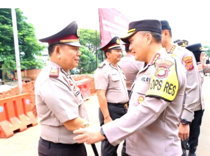 Slipi – Kapolres Metro Jakarta Barat Kombes Pol Pasma Royce memimpin apel pergeseran pasukan gabungan guna pengamanan Imlek 2574/2023, di Mapolres, Palmerah, Jakarta Barat, Sabtu (21/1/2023).