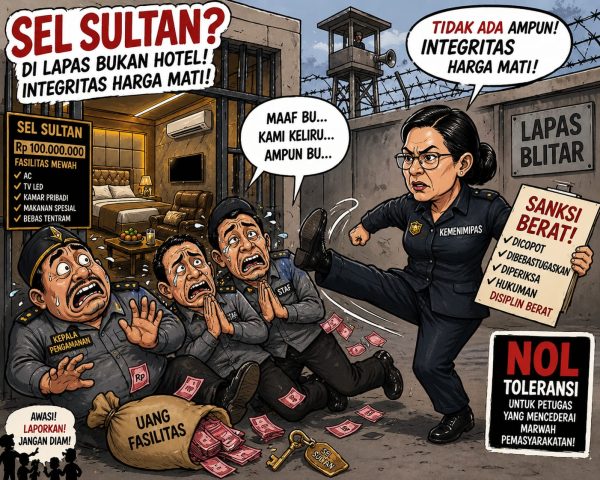 Kasus “sel sultan” di Lapas Blitar menjadi peringatan keras bahwa praktik-praktik transaksional di balik jeruji besi tidak akan ditoleransi. Kemenimipas kini ditantang untuk memastikan penegakan disiplin tidak berhenti pada pencopotan, melainkan berujung pada hukuman setimpal.