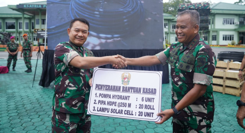 JAYAPURA – Wujud perhatian pimpinan agar pelaksanaan tugas satuan jajaran berjalan sesuai dengan tujuan yang diharapkan, Kepala Staf Angkatan Darat (Kasad) Jenderal TNI Dudung Abdurachman menyerahkan bantuan berupa 6 pompa hydrant, 20 roll pipa HDPE dan 20 unit lampu solar cell kepada Kodam XVII/Cenderawasih.