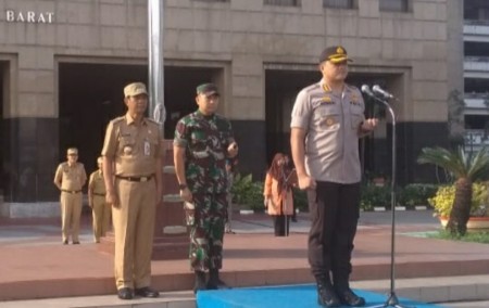 Kembangan – Jelang Natal dan tahun baru 2019 Petugas Gabungan dari Kepolisian Polres Metro Jakarta Barat bersama jajarannya, pemerintah Kotamadya Jakarta Barat, Dinas Perhubungan, Damkar, Kodim 0503/JB, Dinas Pertamanan, Dinas Penerangan, PPSU dan Dinkes DKI menggelar apel gelar pasukan dalam rangka Ops Lilin Jaya 2018 di halaman kantor Walikota Adm Jakarta Barat, Kamis (20/12/2018).
